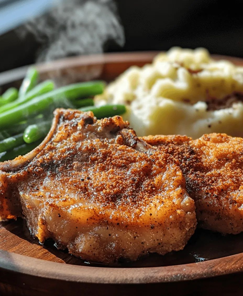 Season the pork chops on both sides with the seasoned salt and pepper and set aside.